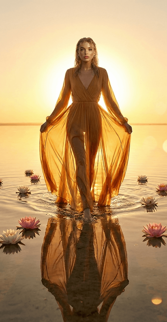 The Birth of Scent – Solar Elegance. Inspired by the luminous Roman heritage of Bvlgari, this visual campaign is an ode to the golden light of dawn and the purity of water. I created a dreamlike narrative where a new fragrance emerges like a jewel from a serene lagoon. By utilizing advanced AI, I achieved flawless interactions between liquid textures, gentle golden reflections, and hyper-realistic skin. This series perfectly balances the brand's sophisticated opulence with the tranquil power of nature, capturing the essence of 'Solar Elegance.'