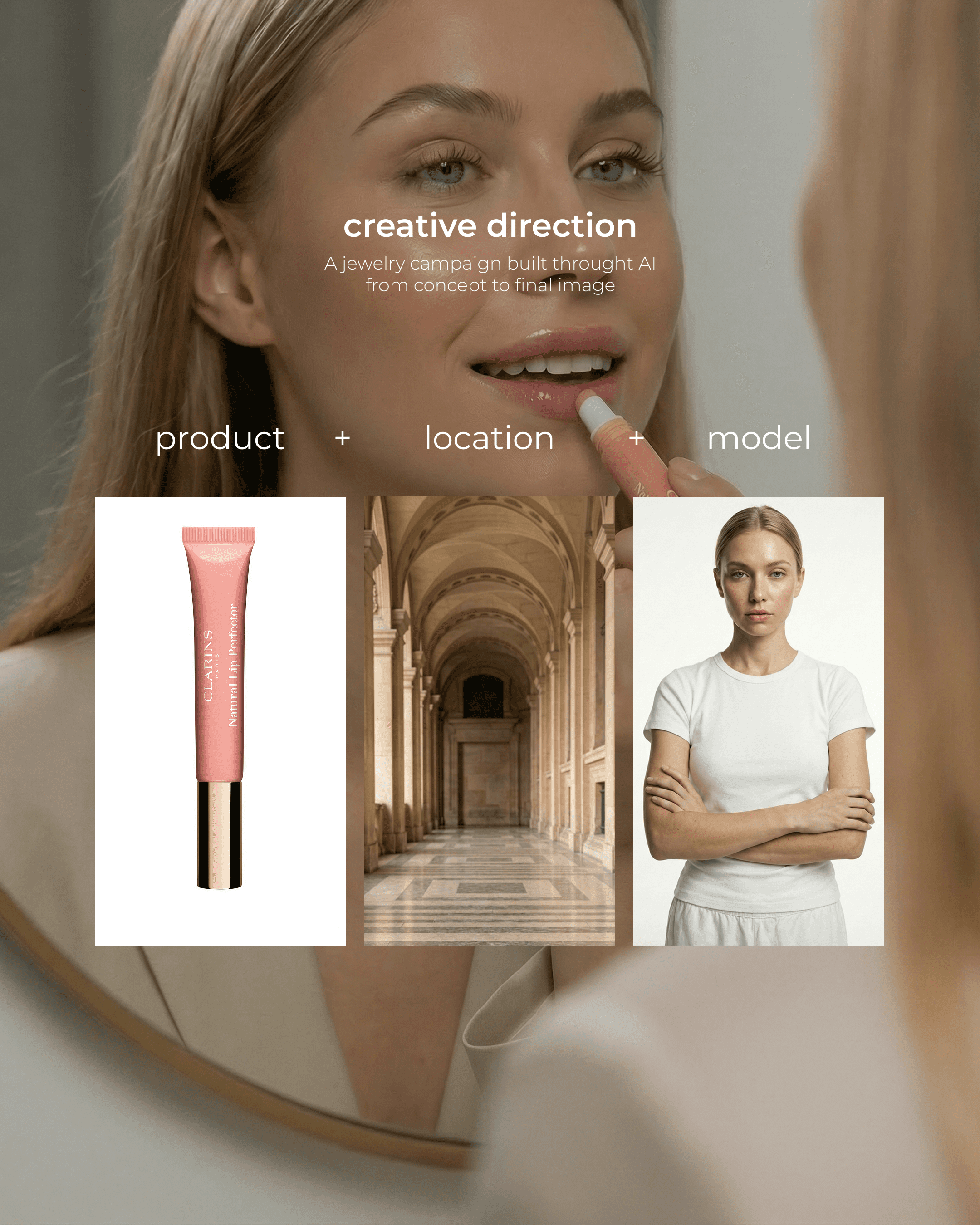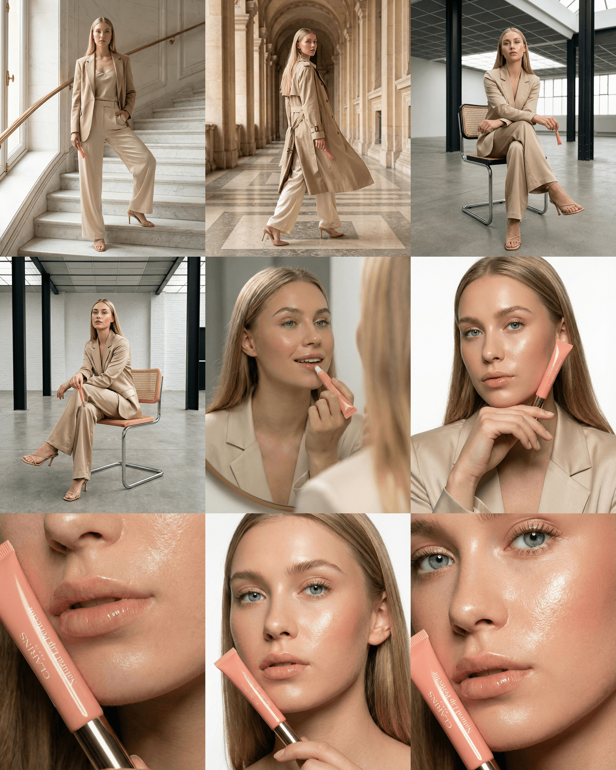 Clarins beauty concept Inspired by the cinematic editorial aesthetics of Vogue and Harper’s Bazaar, this project demonstrates the transformation of a static image into a high-motion campaign for Clarins. I translated a single conceptual reference into a series of high-end visuals: from the confident fluid movement of the model to hyper-realistic product macro shots. With a focus on natural fabric physics, soft lighting, and flawless skin textures, this work blurs the line between AI generation and a professional 35mm film production.